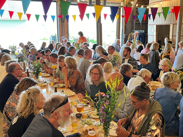 Fællesspisning på gårdbryggeriet – altid økologisk og hjemmelavet mad.